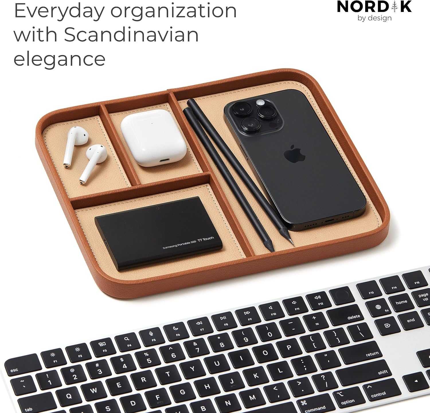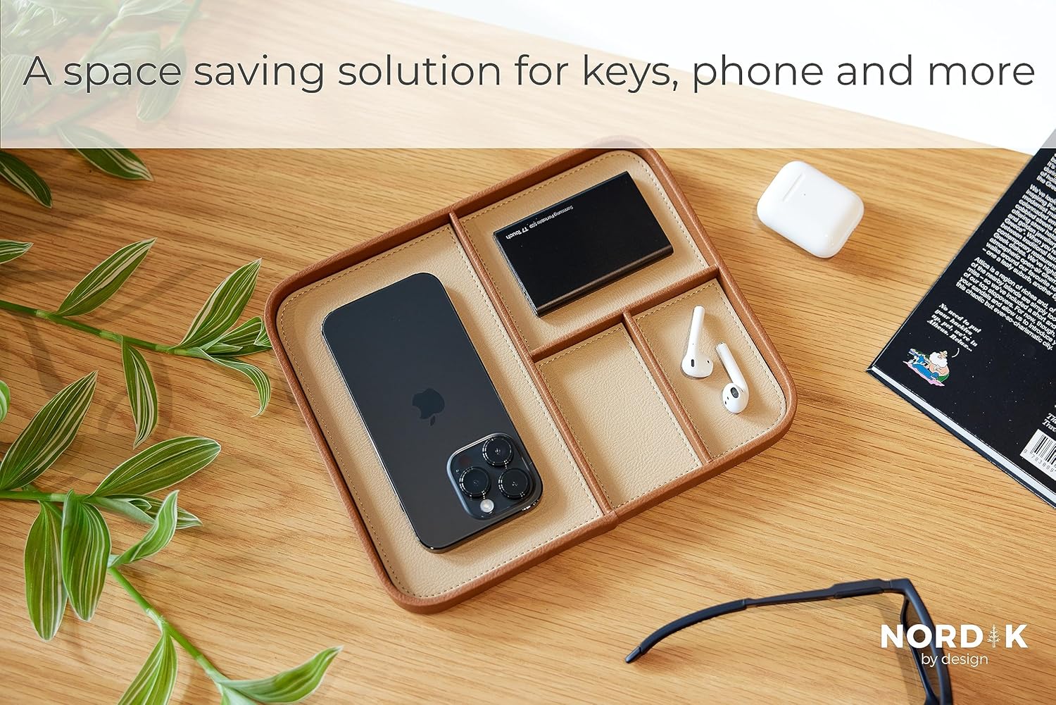 Nordik Leather Valet Tray – Sand Brown – Premium Vegan Leather Stylish and Organized Nightstand Tray for Men – EDC Catchall Tray for Keys, Watch, Wallet, Jewelry – Modern Bedside Caddy
